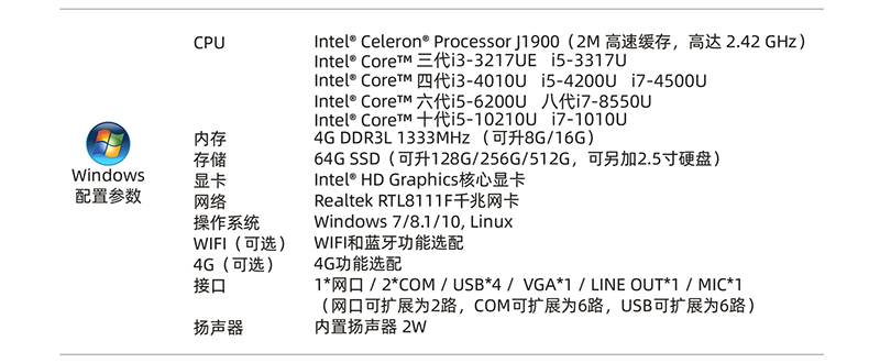 | CPU | 瑞芯微RK3288/RK3568/3588/RK3399、Intel賽揚J1900/酷睿i3/酷睿i5/酷睿i7 板載i3/i5/i7(可選) |